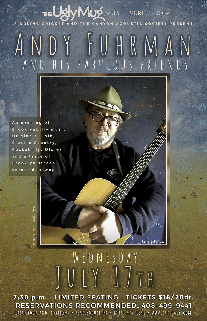 Contact Fiddling Cricket at 408 499 9441 or crbrundle@gmail.com for reservations or more information.Fabulous Friends Indeed .Dan Frechette, Gary 'Sweetpea' Cunningham, Tom Leitzke, Rachel Goodman and Laurie Patton join Andy Fuhrman for an evening of Brooklynbilly music - a mix of Originals, Folk, Classic Country, Rockabilly, Oldies and a taste of Brooklyn street corner doo-wop tunes.