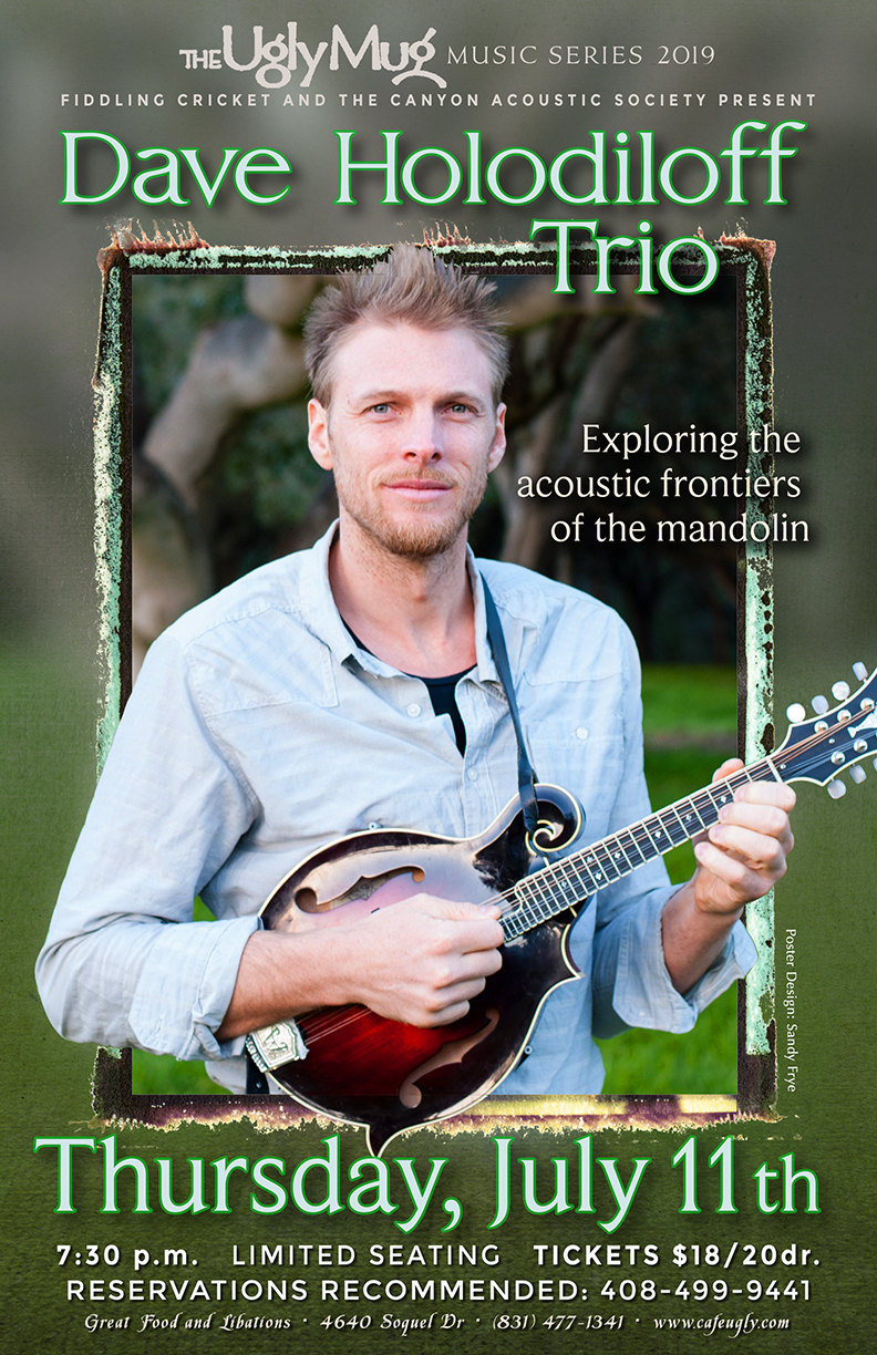 Contact Fiddling Cricket at 408 499 9441 or crbrundle@gmail.com for reservations or more information.Dave Holodiloff, though young, is a master of the mandolin in many styles. Sometimes he is solo, sometimes with as many as 8 in his band. This version is the stripped down trio, featuring an amazing violinist, Elijah McCullar, who also plays the saz (a Turkish 3 string banjo), outstanding pianist, Michael Martinez, and Dave on mandolin, guitar, and vocals. The group will present a unique and diverse blend of originals, Latin, Celtic, Balkan, Gypsy, Jazz, all fused together with Dave's signature funky mandolin style. Get ready for a wild musical adventure that will delight and surprise music fans of all kinds. Dave Holodiloff is a mandolin player, vocalist, composer, and band leader known for his inventive arrangements, expressive musicianship and ability to inspire partnerships with amazing musicians. Dave has made a name for himself as performer, composer, band leader, and the hardest working musician in Monterey! A devoted craftsman on the mandolin, his diverse recordings include Original Music, Bluegrass, Jazz, Celtic, World Favorites, Holiday Classics, and even a Grateful Dead Bluegrass Tribute. Let's get in the groove and let the good times roll! http://daveholodiloff.com