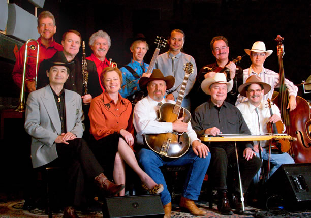 That means guitarist/vocalist Burnham (recently inducted into the WS Hall of Fame) plus steel guitar Hall-of-Famer Bobby Black (Asleep At The Wheel); WS Hall-of-Famer fiddle ace Paul Anastasio (Merle Haggard, Asleep At The Wheel); Mark Holzinger take-off guitar wizard; veteran swing master Bing Nathan, bass; sensational vocalist Pam Brandon (Belle Monroe); Texas piano-pounder Doug Harman; Rick Alegria, drums (Maria Muldaur, Bo Diddley, Asleep at the Wheel); and the LW Longhhorns: Jim Rothermel, reeds, and Kevin Porter, trombone.