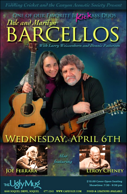 OR contact Fiddling Cricket at 831-475-4938 or Brundle@attglobal.netAmong the few dues paying members of the Santa Cruz musician union back in the 70s and 80's, Dale and Marilyn Barcellos play a mix of music ranging from completely original to generally obscure. They use a wide range of acoustic instruments, but observe no idiomatic traditions in particular, preferring instead to sing in the natural dialects they were born to; no cowboys, no Mississippi delta share croppers, no hillbillies from the hills of Berkeley, just two slightly traumatized "duck and cover" baby boomers trying to survive the coming age of darkness. Long ago, for many years, they were on the road as full-time musicians with up to a 13 piece band. Now they are high school teachers and front The Avalanche Choir (www.avalanchechoir.com) as musicians for fun.