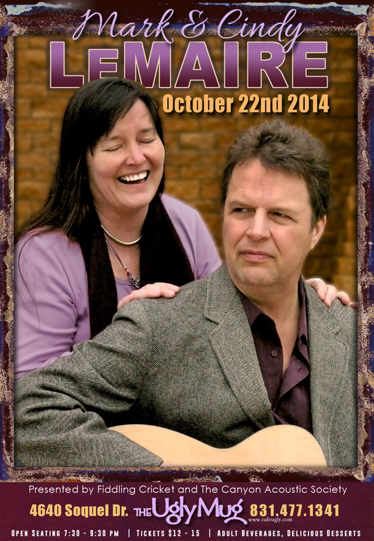 Mark was an up and coming performer about 30 years ago, sharing the stage with the likes of Maria Muldaur and Tracy Chapman, but tendonitis diverted him into a recording engineering career. Only recently in the last few years has he returned to live performance. Cindy has been singing in bands since high school and once toured Europe with the group, Madrigals, performing music from the Renaissance and Middle Ages. www.marklemaire.com
