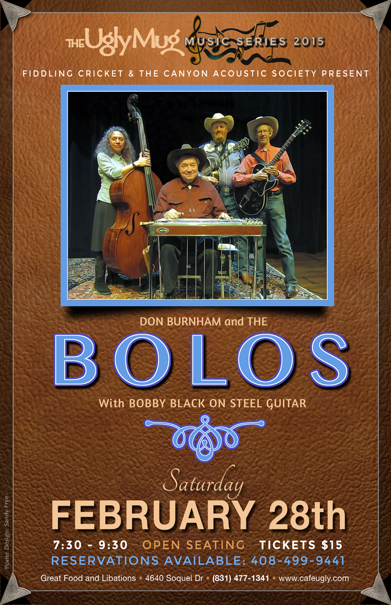 OR contact Fiddling Cricket at 408 499 9441 or Brundle@attglobal.netThe Bolos are Don Burnham (leader of western swing band, Lost Weekend fame ), vocals and guitar, steel guitar Hall of Fame inductee, Bobby Black, steel player for many great bands over the years (Asleep at The Wheel, Commander Cody, New Riders of The Purple Sage), Mark Holzinger, lead guitar and also a Lost Weekend alumni, and Karen Horner, bass and vocals. The group plays a mixture of classic Western Swing and some country and Don Burnham originals. www.donburnham.com
