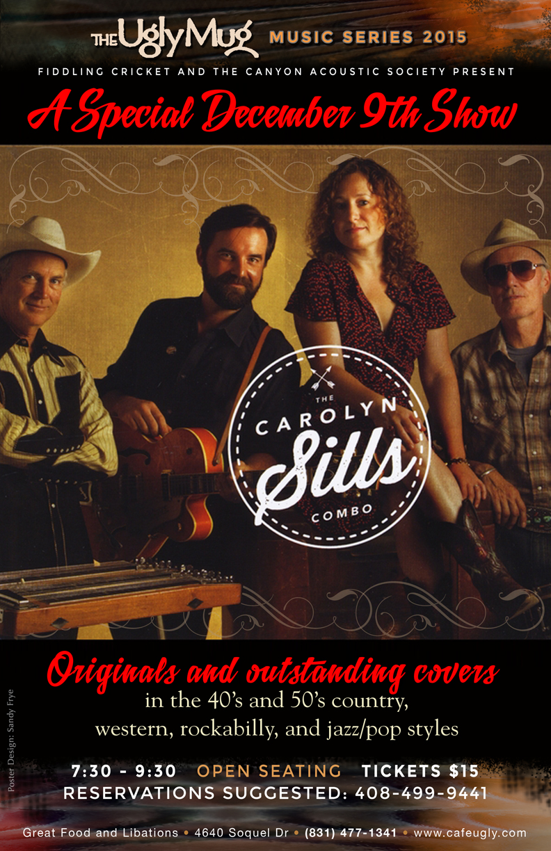 Contact Fiddling Cricket at 408 499 9441 or crbrundle@gmail.comCarolyn Sills and husband, guitarist Gerard Egan, moved out west, about 6 years ago, from the thriving New York music scene, where they played rockabilly and country and Carolyn also sang jazz with the likes of Les Paul. In Santa Cruz she has developed a well-deserved following, whether for the Santa Claus is Real 40s and 50s Christmas spectacular, now in its 5th year at Don Quixotes, her Patsy Cline Birthday Bash (she can nail any Patsy song!), which has moved around from dive bars to Kuumbwa this year, or the Valentines Day double bill show at Kuumbwa with Henhouse. Late night she can sometimes be found performing rockabilly/western at Moes Alley or The Crepe Place.