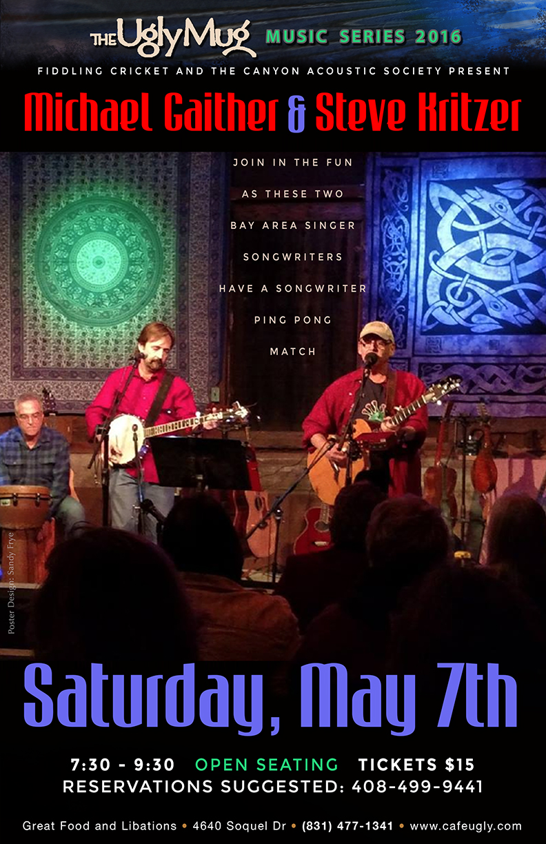Contact Fiddling Cricket at 408 499 9441 or crbrundle@gmail.comMichael Gaither and Steve Kritzer are veteran Bay Area singer/songwriters who joined forces as a duo after they first played The Ugly Mug back on a split bill back in 2009. Their show, which they refer to as a "songwriter ping pong match," is a fun mix of original and cover songs, backed by guitars, ukuleles, banjo, and mandolin, with lots of jokes, stories, and audience participation. This is Michael and Steve's fourth appearance as a duo at The Ugly Mug and in this show they'll be joined by Jeff Baker on percussion. http://www.michaelgaither.com http://www.stevekritzer.com
