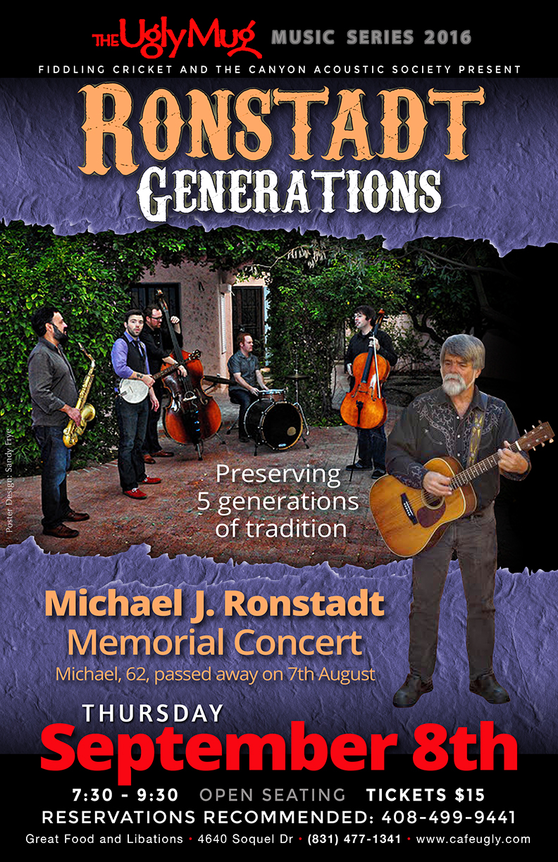 Contact Fiddling Cricket at 408 499 9441 or crbrundle@gmail.comIn 2013 we were fortunate enough to have three members of this famous Tucson musical family, Michael J. Ronstadt (Linda's brother), and his two sons, Michael G. and Petie, play in the Ugly Mug concert series. That concert, with its wonderful intimate vibe, received the best audience feedback of all the 100 or so shows we have had there. They were generous enough to return in 2015, and agreed to come once again in 2016. On August the 7th, 2016, Michael J. lost a short intense battle with cancer. His sons, together with friend and colleague, Alex Flores, from their larger Tucson ensemble, are continuing with this tour, which they are informally calling the "Michael J. Ronstadt Memorial Tour".