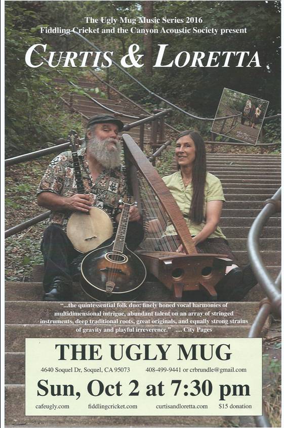 Contact Fiddling Cricket at 408 499 9441 or crbrundle@gmail.comThe husband and wife duo of Curtis Teague and Loretta Simonet, from Minneapolis are "old school" folkies. They deliver finely honed vocal harmonies and have abundant talent on an array of stringed instruments (mandocello, mandolin, Celtic harp, guitar, uke, and banjo). Their traditional roots are deep, based in the English folk form, though much of their material is original and contemporary. They have been singing and playing together ever since a chance meeting on a Santa Cruz beach in 1977, where Loretta was practicing guitar for a variety show. They have 9 CD's, have shared the stage with many folk luminaries over the years, and have been voted "Best Acoustic Performers in The Twin Cities" in the past. Though this is their first California tour for many years, they used to play regularly in the Bay Area and Santa Cruz areas, and were one of the first acts to play for Fiddling Cricket some 20 years ago. www.curtisandloretta.com
