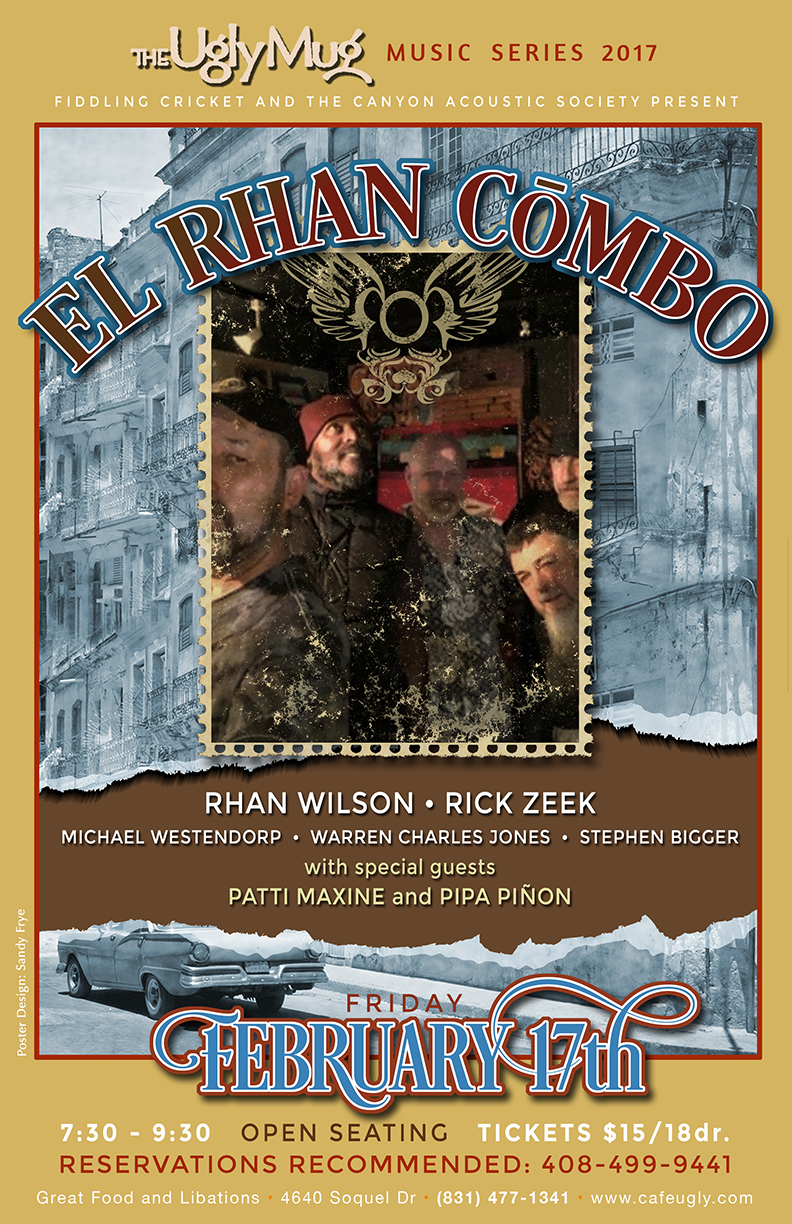 Contact Fiddling Cricket at 408 499 9441 or crbrundle@gmail.com for reservations or more information.El Rhan Combo is the rhythmically enhanced version of Rhan Wilson and friends. Featuring Rick Zeek on guitar and vocals, Michael Westendorp on bass, and this year's Gail Rich Award recipient Patti Maxine on lap steel - these good musical friends enjoy the addition of Stephen Bigger on keyboards, and Warren Charles Jones on percussion. Taking the entire evening to unimaginable angelic heights will be Pipa Piñon on vocals.