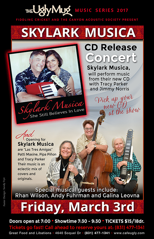 Under the name of "Las Tres Amigas", three of Santa Cruz' finest female singers/players (Tracy Parker, bassist and vocalist with Henhouse; vocalist and ukulele player, Pipa Pinon, and this year's Gail Rich Awards winner, steel guitarist and vocalist, Patti Maxine) will open for Skylark, playing an eclectic mix of covers and originals. www.skylarkmusica.com