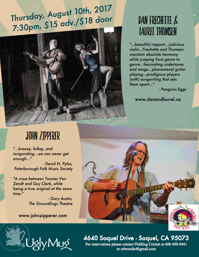 Dan Frechette and Laurel Thomsen(local): Meeting via a chance YouTube sighting, and fueled by rare musical chemistry, eclectic Roots-Folk songwriters Dan Frechette, guitar/vocals, and Laurel Thomsen, violin/vocals, prove that musical magic is not only possible, but as described by the Monterey Herald, "a match made in heaven". Both powerful and magnetic talents, over the past five years this Canadian-American duo has toured extensively throughout the U.S. and Canada, releasing two albums. They have played several times in our series. www.danandlaurel.ca