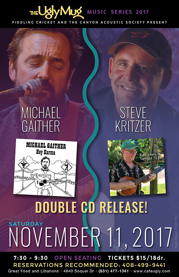 Contact Fiddling Cricket at 408 499 9441 or crbrundle@gmail.com for reservations or more information.Back in 2009, two local singer-songwriters, Michael Gaither and Steve Kritzer split a night at The Ugly Mug. They'd never played together before and approached the evening as a mini songwriter "in-the-round", trading originals back and forth and backing each other up on a variety of instruments - guitar, banjo, mandolin, harmonica, ukulele.