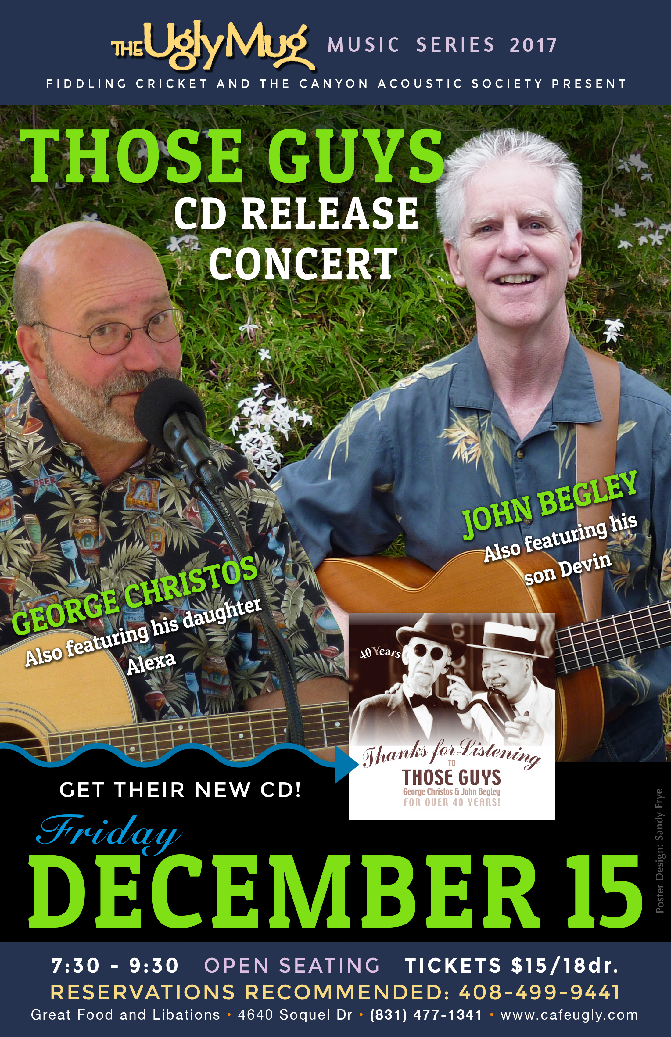 Contact Fiddling Cricket at 408 499 9441 or crbrundle@gmail.com for reservations or more information.George Christos and John Begley, otherwise known as Those Guys, are celebrating 40 plus years of performing together with a brand new CD, "Thanks for Listening". The music is a mix of Pop, Folk, Country and Americana. They will be playing songs from this new album, in addition to many other favorites. Like previous Ugly Mug shows they have performed for us, George's daughter, Alexa and John's son, Devin will open the show with their own blend of covers and originals. Please come along and help George and John celebrate their 40 years together, and be prepared to join in on some of the classics.