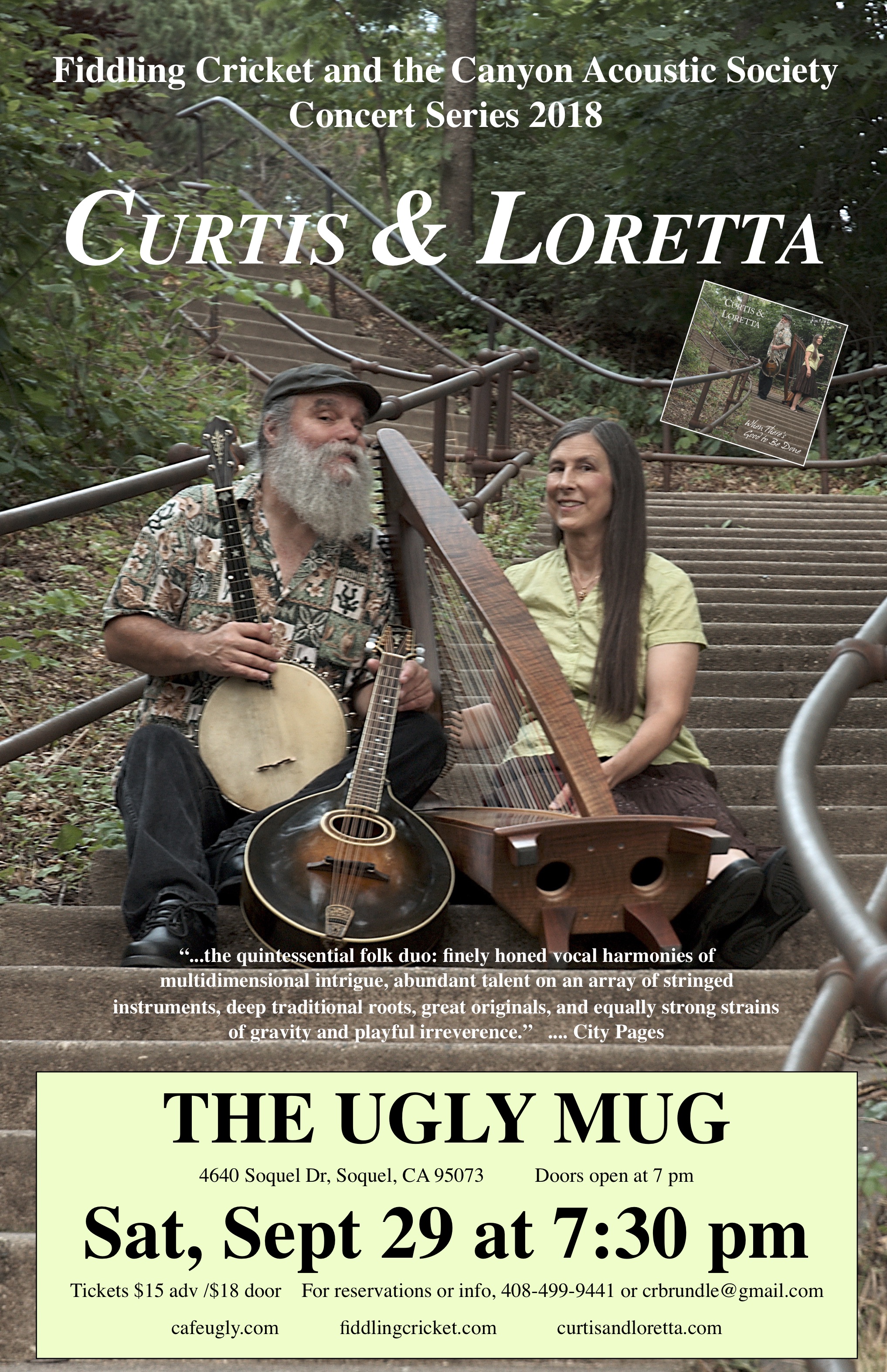 Contact Fiddling Cricket at 408 499 9441 or crbrundle@gmail.com for reservations or more information.The husband and wife duo of Curtis Teague and Loretta Simonet, from Minneapolis are "old school" folkies. They deliver finely honed vocal harmonies and have abundant talent on an array of stringed instruments (mandocello, mandolin, Celtic harp, guitar, uke, and banjo). Their traditional roots are deep, based on the English folk form, though much of their material is original and contemporary. They have been singing and playing together ever since a chance meeting on a Santa Cruz beach in 1977, where Loretta was practicing guitar for a variety show. They have 9 CD's, have shared the stage with many folk luminaries over the years, and have been voted "Best Acoustic Performers in The Twin Cities" in the past. They used to play regularly in the Bay Area and Santa Cruz areas, and resumed doing this a couple of years ago . They were also one of the first acts to play for Fiddling Cricket some 20 years ago.http://www.curtisandloretta.com