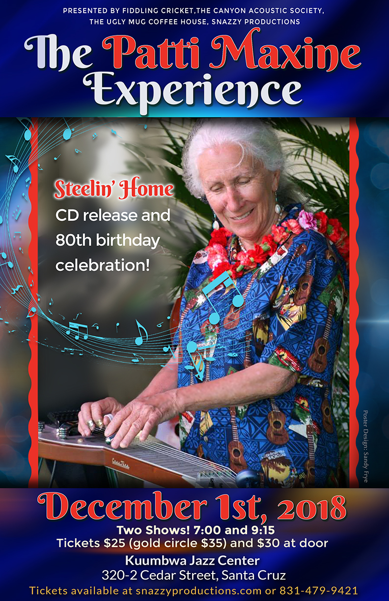 Call Snazzy for tickets 831 479-9421 or buy tickets herePatti Maxine is a Santa Cruz music icon affectionately known as "The Queen of Steel" for her signature lap steel playing. She will celebrate her 80th year*, her 66th year performing, the release of her first album, Steelin' Home, and her change in hairstyle (no longer silver flowing waist length) with her music friends and her fans. Backed by a full band, Patti will also play and sing solo and with other guest artists.