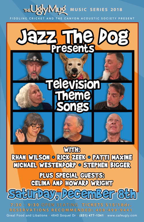 Contact Fiddling Cricket at 408 499 9441 or crbrundle@gmail.com for reservations or more information.Rhan Wilson, Rick Zeek, and their band Jazz The Dog present an evening of classic Television Theme Songs at The Ugly Mug on December 8th. Known for their previous productions of An Altared Christmas, An Altared 420, and other themed musical evenings - Rhan and Rick are joined by Patti Maxine, Michael Westendorp, Stephen Bigger and, flying in from Washington for this event: Celina and Howard Wright.