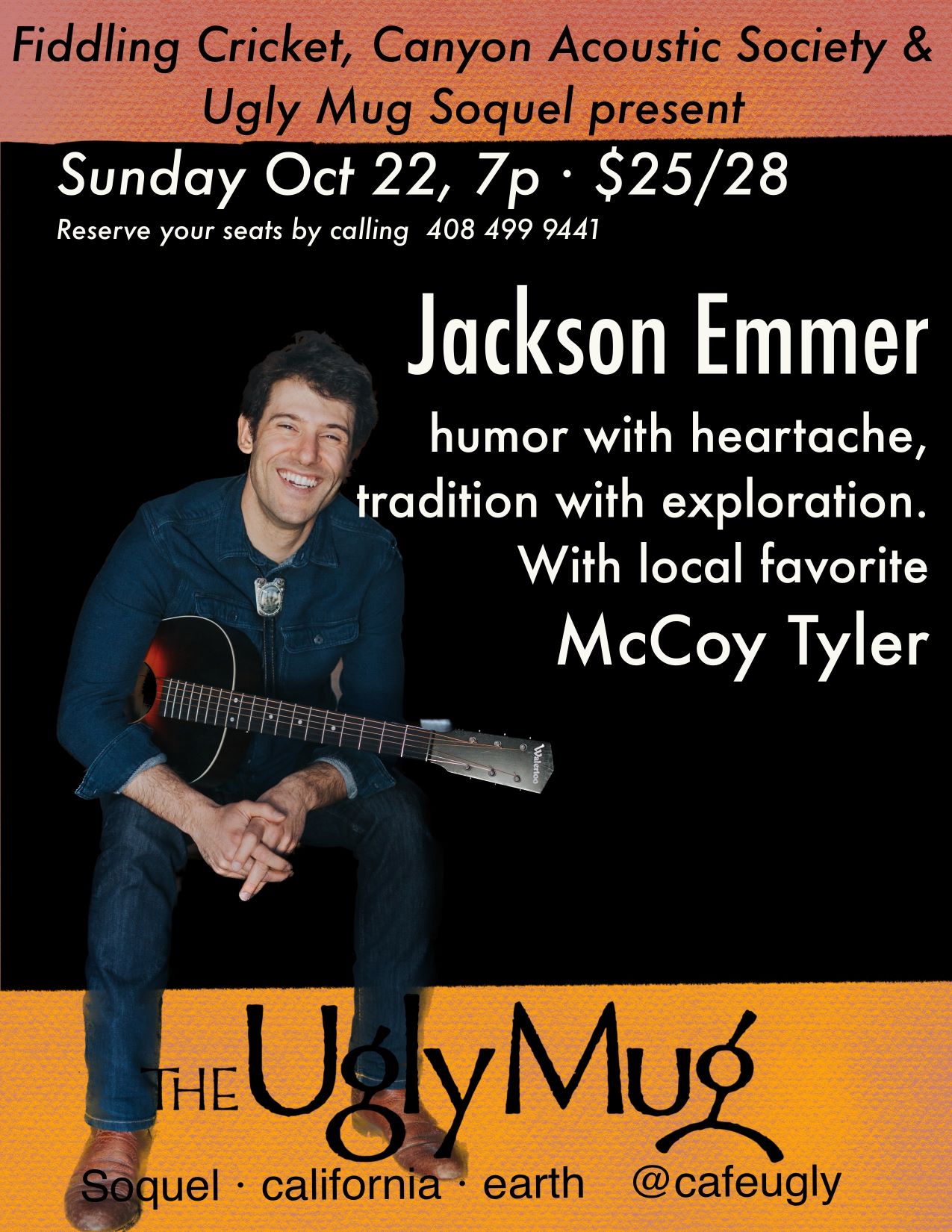 Food and Drink: Beer, wine, coffee, tea and soft drinks available. Usual coffee shop food. (if you wish, bring your own wine and pay corkage)"Few are writing songs like Jackson Emmer." - Rolling Stone Jackson Emmer is an award-winning singer, songwriter, and producer from Carbondale, Colorado. His work blends humor with heartache, and tradition with exploration. Emmer's writing is often compared to that of John Prine and Guy Clark. He has toured the US since 2009, collaborated with Grammy-winners, and co-written 40+ songs with folk music legend, Tom Paxton. Emmer has opened for Robert Earl Keen, Sierra Ferrell, and Tim McGraw. His work has been featured in Rolling Stone, Billboard, 1200+ Spotify playlists, and 200+ radio stations worldwide. McCoy Tyler is a fine local singer-songwriter and expert guitarist. He has played solo in our series in the past, and sits in with such bands as The Coffis Brothers. In this show he will accompany Jackson, and take a few leads. https://www.jacksonemmer.com